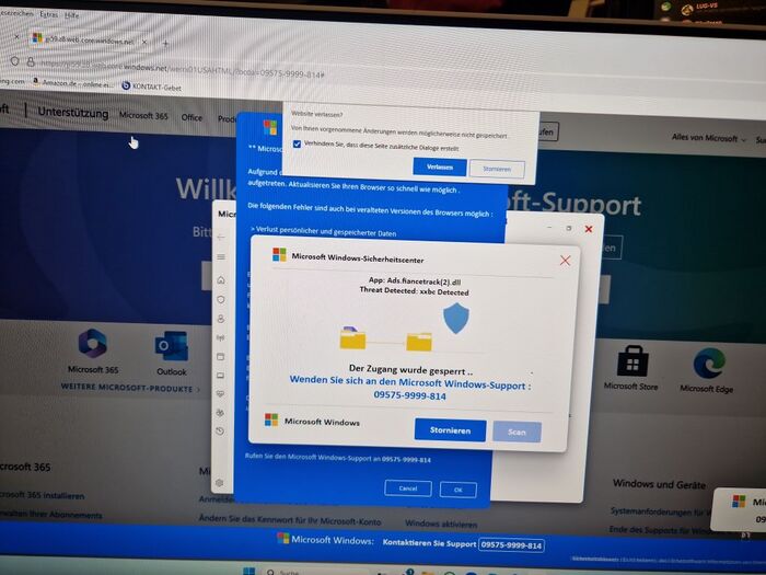 - Im Firefox-Verlauf (Chronik) fand Holger weit oben diesen Link: [https://jji59.z8.web.core.windows.net/werrx01USAHMTL/?bcda=09575-9999-814#]. Er funktionierte nicht, aber nachdem Holger auf Sitzung wiederherstellen klickte, öffnete sich ein PopUp (ohne die Männerstimme, welche Holger am Telefon – während er mit der befreundeten Familie telefonierte – gehört hatte).